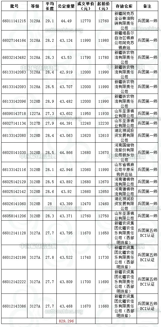 9月14日兵團棉競賣交易成交結(jié)果