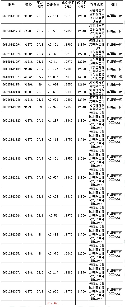 9月15日新疆棉競(jìng)賣交易兵團(tuán)專場(chǎng)推出資源量為21530.107噸,實(shí)際成交912.621噸,成交率4.24%,最高成交價(jià)13010元/噸,最低成交價(jià)11750元/噸,成交均價(jià)12207元/噸,平均長(zhǎng)度28.23。中國棉花信息網(wǎng)統(tǒng)計(jì),截至9月15日,兵團(tuán)已累計(jì)成交資源32299.544噸。