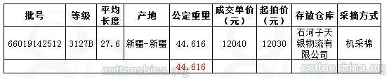 9月17日新疆棉競賣交易推出資源量為5028.047噸,實際成交44.616噸,成交比例0.89%;最高成交價12040元/噸,最低成交價12040元/噸;成交平均價格12040元/噸,平均長度27.60。
