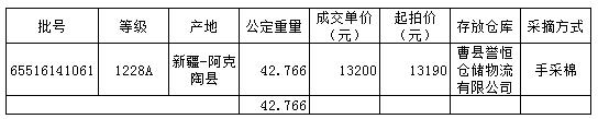 9月18日新疆棉競賣交易推出資源量為5035.957噸,實際成交42.7660噸,成交比例0.85%;成交價13200元/噸,長度28.60。