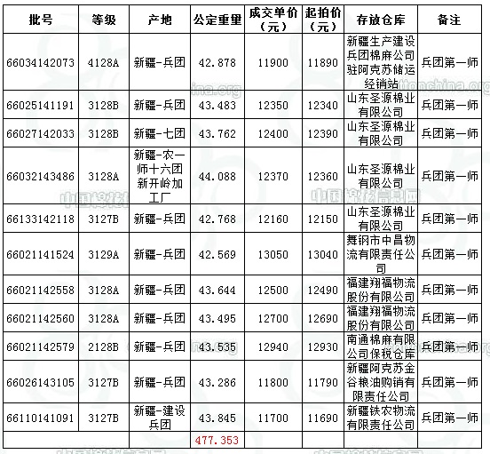 今日全部為兵團(tuán)第一師成交477.353噸,占當(dāng)日該師上市資源量的2.39%。