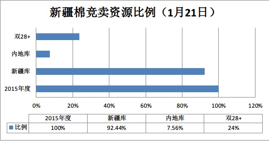全國棉花交易市場定于1月21日上市新疆棉競賣資源4023.704噸(均為2015年度資源),最低起拍價11800元/噸。其中新疆庫區(qū)資源3719.392噸,內(nèi)地庫區(qū)資源僅304.312噸。其中雙28+資源占950.636噸。
