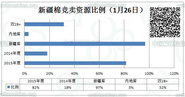全國棉花交易市場(chǎng)定于1月26日上市新疆棉競(jìng)賣資源4044.069噸(其中XJ201601260001-0019為特價(jià)棉,不接受復(fù)檢),最低起拍價(jià)降至10490元/噸。其中新疆庫區(qū)資源3915.001噸,內(nèi)地庫區(qū)資源僅129.068噸。其中雙28+資源占1276.275噸。