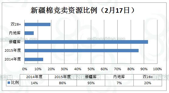 全國棉花交易市場定于2月17日上市新疆棉競賣資源3768.32噸,最低起拍價(jià)10040元/噸。其中特價(jià)棉14批(不接受復(fù)檢)。新疆庫資源占3507.452噸,內(nèi)地庫資源占260.868噸。其中雙28+資源占735.753噸。