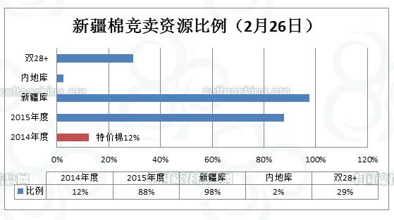 全國棉花交易市場定于2月26日上市新疆棉競賣資源3576.217噸,最低起拍價9540元/噸,(其中有特價棉14批,不接受復檢)另有17批資源為性價比較高資源。新疆庫資源占3488.015噸,內(nèi)地庫資源占88.202噸。其中雙28+資源占1051.427噸。
