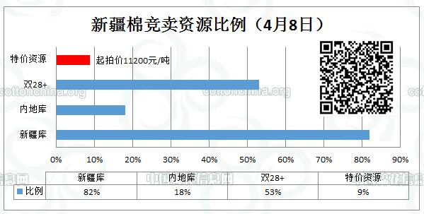 全國棉花交易市場定于4月8日上市新疆棉競賣資源2211.81噸,其中新增5批特價(jià)棉,最低起拍價(jià)11200元/噸。其中,新疆庫資源占1811.737噸(南疆公司資源占1261.385噸,最低起報(bào)價(jià)11800元/噸),內(nèi)地庫資源占400.437噸(新增山東庫資源,最低起報(bào)價(jià)11750元/噸),雙28+資源占1174.053噸。