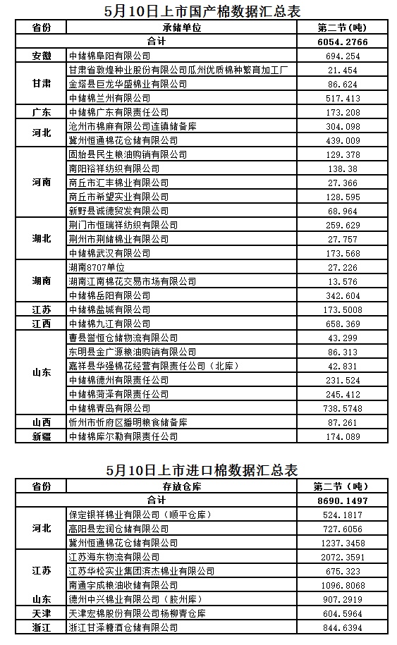 定于5月10日第二節(jié)出庫銷售儲備棉14744.4263噸,其中國產(chǎn)棉6054.2766噸,進口棉8690.1497噸。相關(guān)批次公檢數(shù)據(jù)見附件。具體庫點如下: