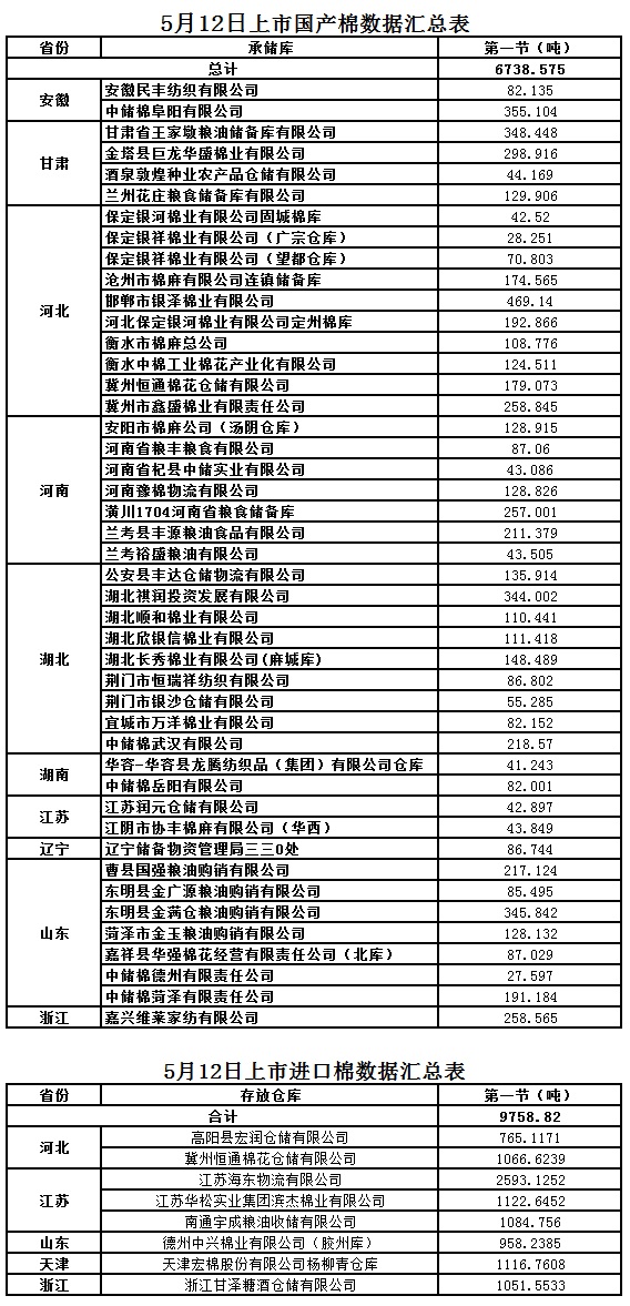 定于5月12日第一節(jié)出庫銷售儲備棉16497.395噸,其中國產棉6738.5750噸,進口棉9758.82噸。相關批次公檢數據見附件。具體庫點如下: