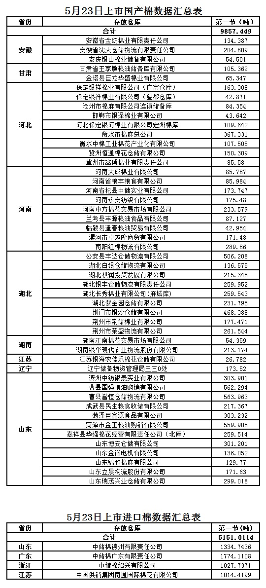 定于5月23日第一節(jié)出庫銷售儲(chǔ)備棉15008.4604噸,其中國產(chǎn)棉9857.4490噸,進(jìn)口棉5151.0114噸。相關(guān)批次公檢數(shù)據(jù)見附件。具體庫點(diǎn)如下。
