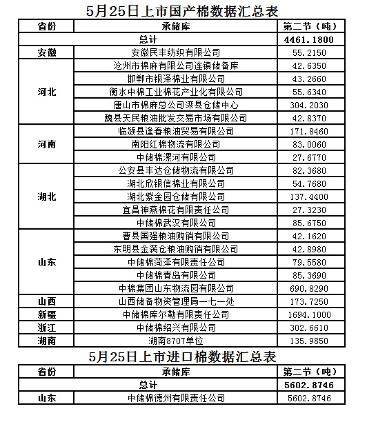 定于5月25日第二節(jié)銷售儲備棉10064.0546噸,其中國產(chǎn)棉4461.1800噸,進(jìn)口棉5602.8746噸,相關(guān)批次公檢數(shù)據(jù)見附件。具體庫點如下。