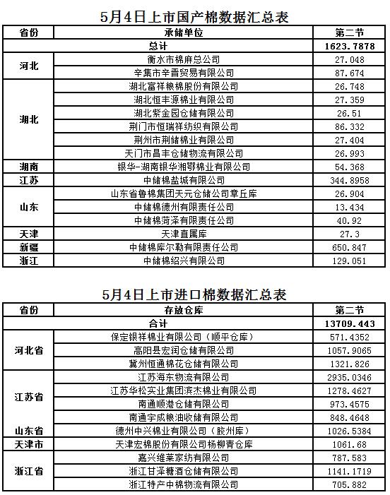 定于5月4日第二節(jié)出庫銷售儲(chǔ)備棉15333.2308噸;其中國產(chǎn)棉1623.7878噸、進(jìn)口棉13709.443噸。相關(guān)批次公檢數(shù)據(jù)見附件。具體庫點(diǎn)如下: