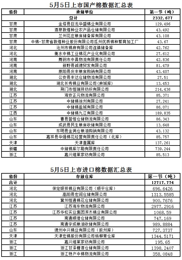 定于5月5日第一節(jié)出庫銷售儲(chǔ)備棉15050.451噸;其中國(guó)產(chǎn)棉2332.6770噸,進(jìn)口棉12717.774噸。相關(guān)批次公檢數(shù)據(jù)見附件。具體庫點(diǎn)如下: