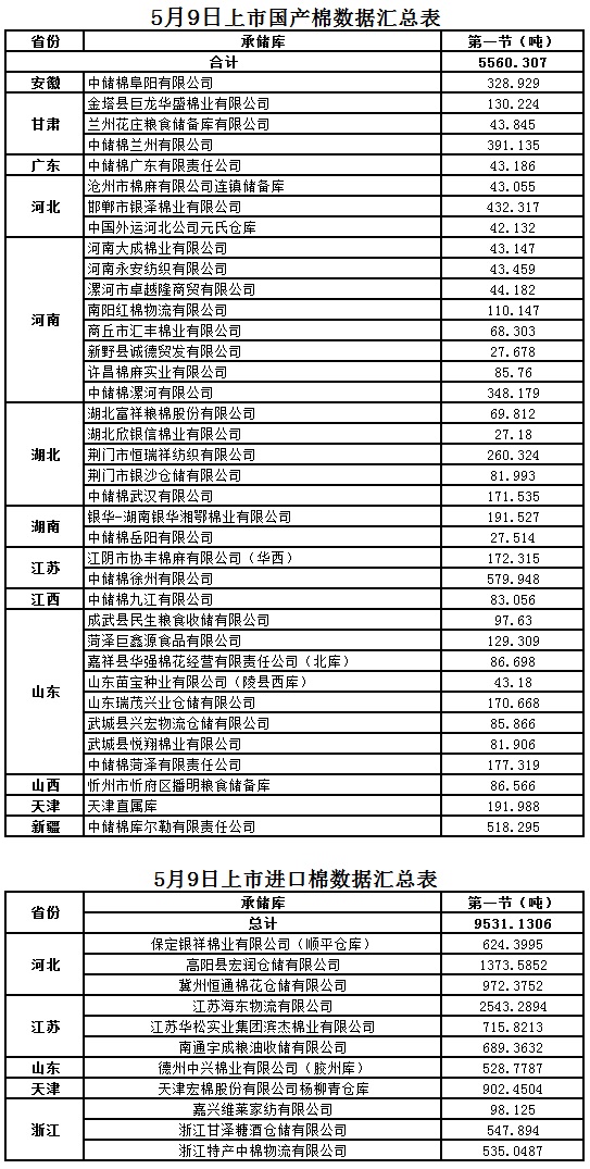定于5月9日第一節(jié)出庫(kù)銷售儲(chǔ)備棉15091.4376噸;其中國(guó)產(chǎn)棉5560.307噸,進(jìn)口棉9531.1306噸。相關(guān)批次公檢數(shù)據(jù)見(jiàn)附件。具體庫(kù)點(diǎn)如下: