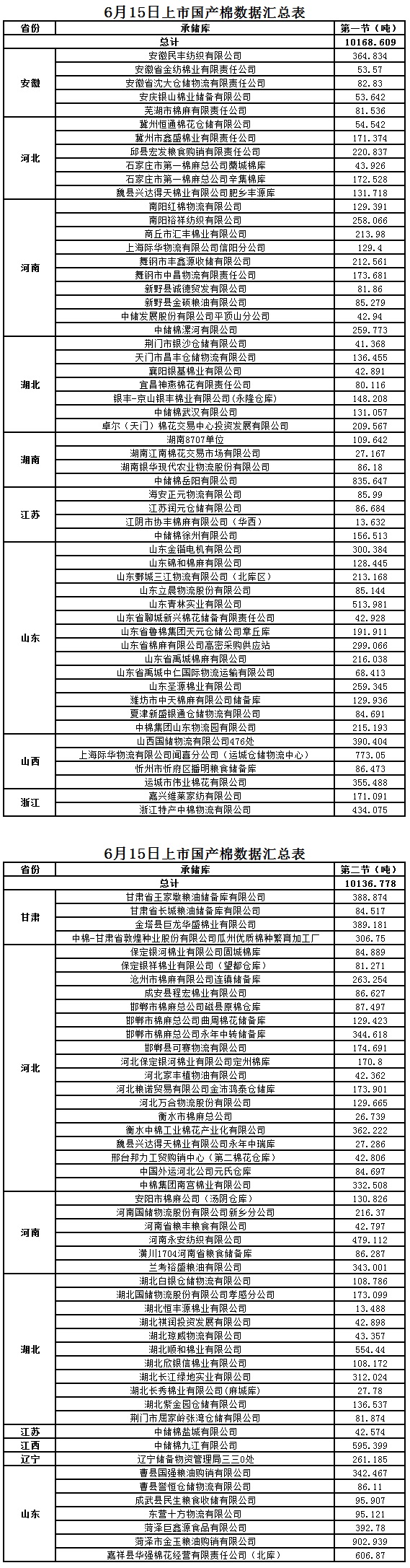 6月15日兩節(jié)共計銷售儲備棉20305.387噸。第一節(jié)銷售儲備棉10168.6090噸,其中國產(chǎn)棉10168.6090噸、進口棉0噸。第二節(jié)銷售儲備棉10136.7780噸,其中國產(chǎn)棉10136.7780噸、進口棉0噸。