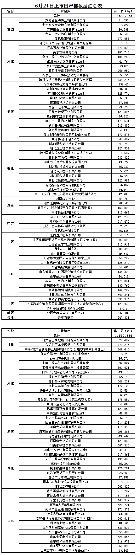6月21日兩節(jié)共計輪出儲備棉23388.944噸。第一節(jié)計劃輪出儲備棉11849.0580噸,其中國產(chǎn)棉11849.0580噸、進(jìn)口棉0噸。第二節(jié)計劃輪出儲備棉11539.8860噸,其中國產(chǎn)棉11539.8860噸、進(jìn)口棉0噸。