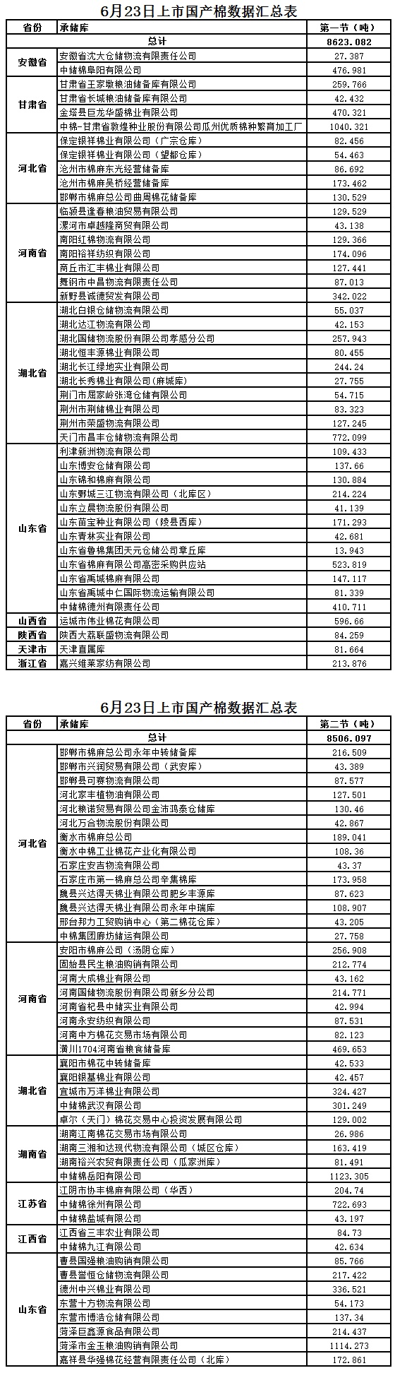 6月23日兩節(jié)共計(jì)輪出儲(chǔ)備棉17129.179噸。第一節(jié)計(jì)劃輪出儲(chǔ)備棉8623.0820噸,其中國(guó)產(chǎn)棉8623.0820噸、進(jìn)口棉0噸。第二節(jié)計(jì)劃輪出儲(chǔ)備棉8506.0970噸,其中國(guó)產(chǎn)棉8506.0970噸、進(jìn)口棉0噸。