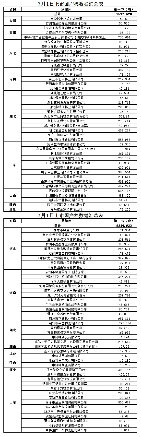 7月1日兩節(jié)共計(jì)輪出儲(chǔ)備棉18832.5510噸。第一節(jié)銷(xiāo)售儲(chǔ)備棉9597.6280噸,其中國(guó)產(chǎn)棉9597.6280噸、進(jìn)口棉0噸。第二節(jié)銷(xiāo)售儲(chǔ)備棉9234.9230噸,其中國(guó)產(chǎn)棉9234.9230噸、進(jìn)口棉0噸。
