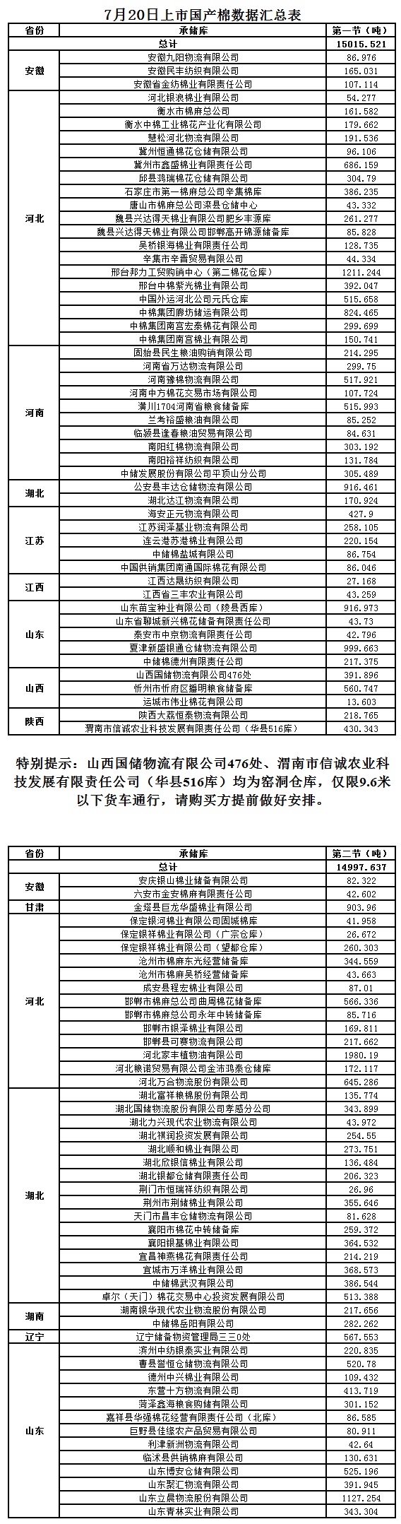 7月20日兩節(jié)共計(jì)輪出儲(chǔ)備棉30013.158噸。第一節(jié)計(jì)劃輪出儲(chǔ)備棉15015.5210噸,其中國產(chǎn)棉15015.5210噸、進(jìn)口棉0噸。第二節(jié)計(jì)劃輪出儲(chǔ)備棉14997.6370噸,其中國產(chǎn)棉14997.6370噸、進(jìn)口棉0噸。