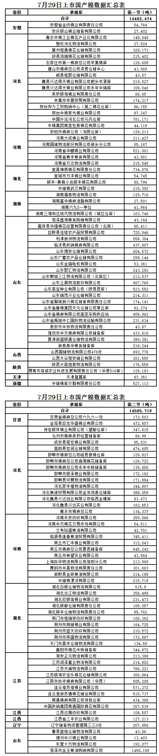 7月29日兩節(jié)共計輪出儲備棉29068.193噸。第一節(jié)計劃輪出儲備棉14482.4740噸,其中國產(chǎn)棉14482.4740噸、進口棉0噸。第二節(jié)計劃輪出儲備棉14585.7190噸,其中國產(chǎn)棉14585.7190噸、進口棉0噸。