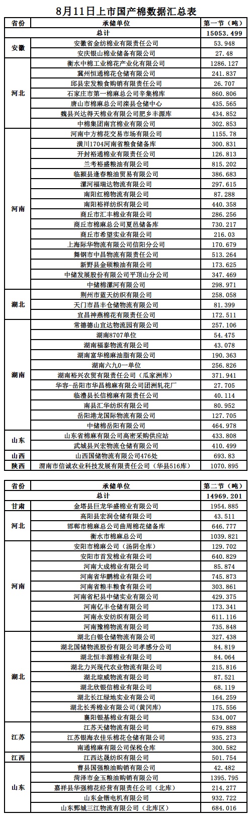 8月11日兩節(jié)共計(jì)輪出儲(chǔ)備棉30022.700噸。第一節(jié)計(jì)劃輪出儲(chǔ)備棉15053.4990噸,其中國(guó)產(chǎn)棉15053.4990噸、進(jìn)口棉0噸。第二節(jié)計(jì)劃輪出儲(chǔ)備棉14969.2010噸,其中國(guó)產(chǎn)棉14969.2010噸、進(jìn)口棉0噸。
