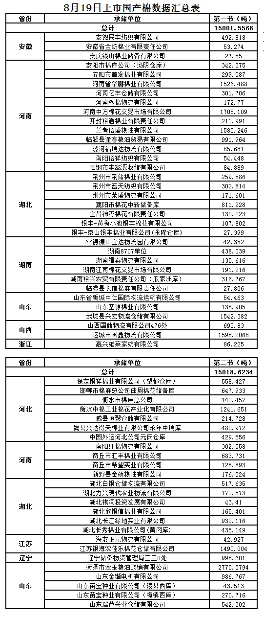8月19日兩節(jié)共計(jì)輪出儲備棉30020.1802噸。8月19日第一節(jié)銷售儲備棉15001.5568噸,其中國產(chǎn)棉15001.5568噸、進(jìn)口棉0噸。第二節(jié)銷售儲備棉15018.6234噸,其中國產(chǎn)棉15018.6234噸、進(jìn)口棉0噸。