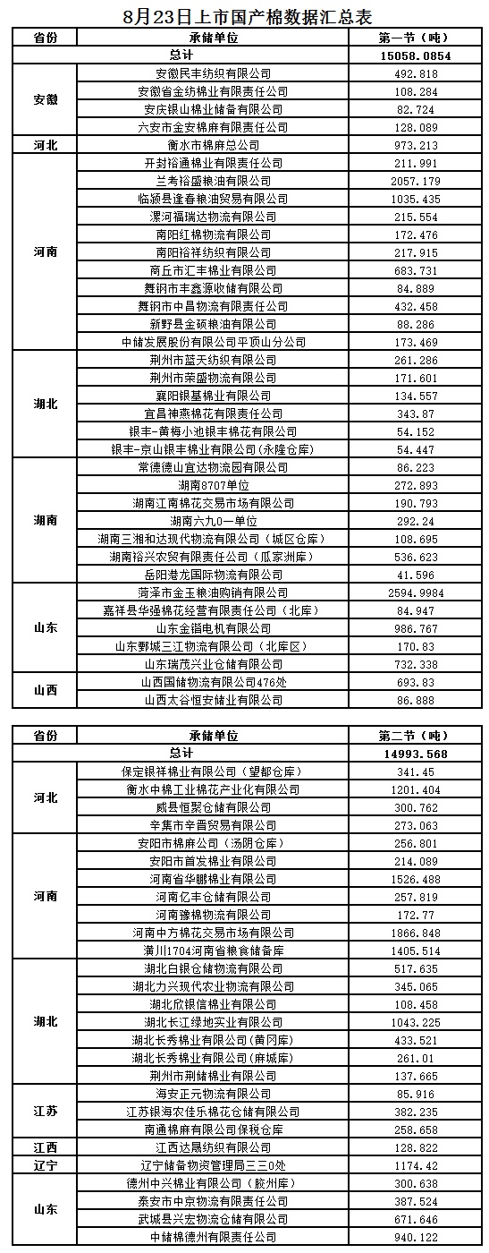 8月23日兩節(jié)共計(jì)輪出儲(chǔ)備棉30051.6534噸。8月23日第一節(jié)銷售儲(chǔ)備棉15058.0854噸,其中國產(chǎn)棉15058.0854噸、進(jìn)口棉0噸。8月23日第二節(jié)銷售儲(chǔ)備棉14993.568噸,其中國產(chǎn)棉14993.568噸、進(jìn)口棉0噸。