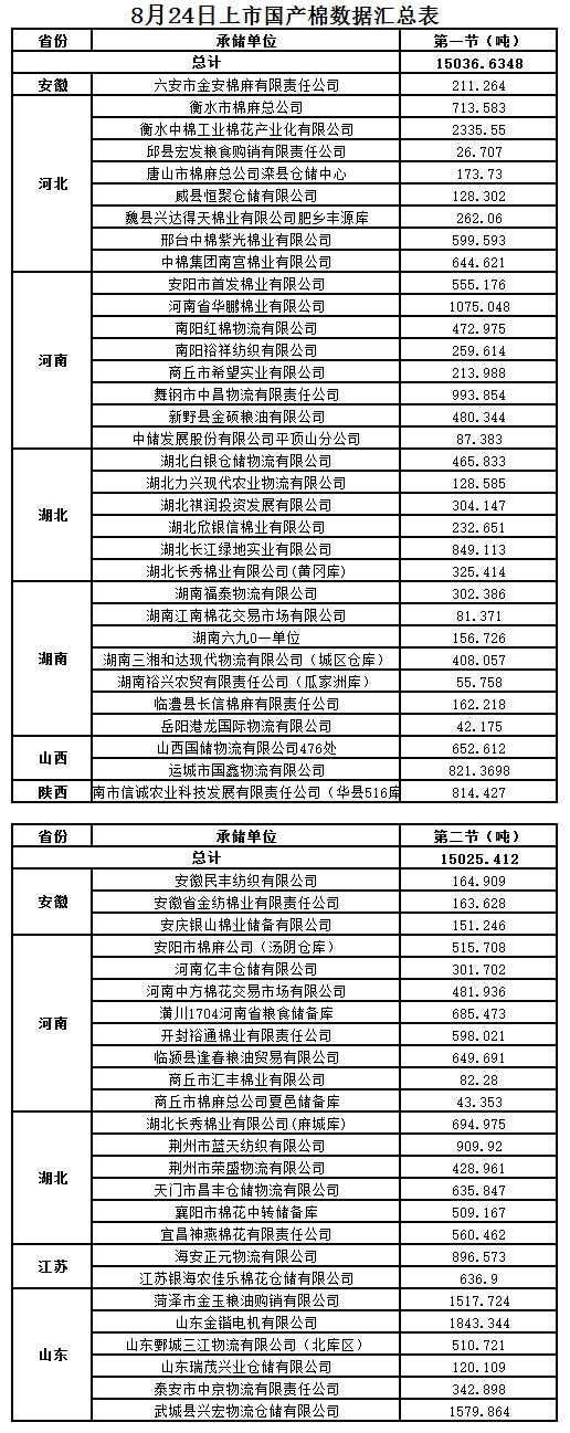 8月24日兩節(jié)共計輪出儲備棉30062.0468噸。8月24日第一節(jié)銷售儲備棉15036.6348噸,其中國產(chǎn)棉15036.6348噸、進口棉0噸。8月24日第二節(jié)銷售儲備棉15025.412噸,其中國產(chǎn)棉15025.412噸、進口棉0噸。