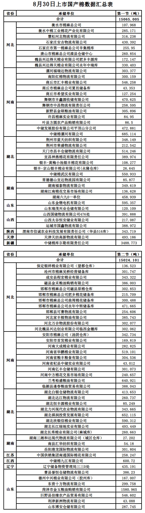 8月30日兩節(jié)共計(jì)輪出儲(chǔ)備棉30089.106噸。8月30日第一節(jié)銷售儲(chǔ)備棉15065.005噸,其中國(guó)產(chǎn)棉15065.005噸、進(jìn)口棉0噸。8月30日第二節(jié)銷售儲(chǔ)備棉15024.101噸,其中國(guó)產(chǎn)棉15024.101噸、進(jìn)口棉0噸。