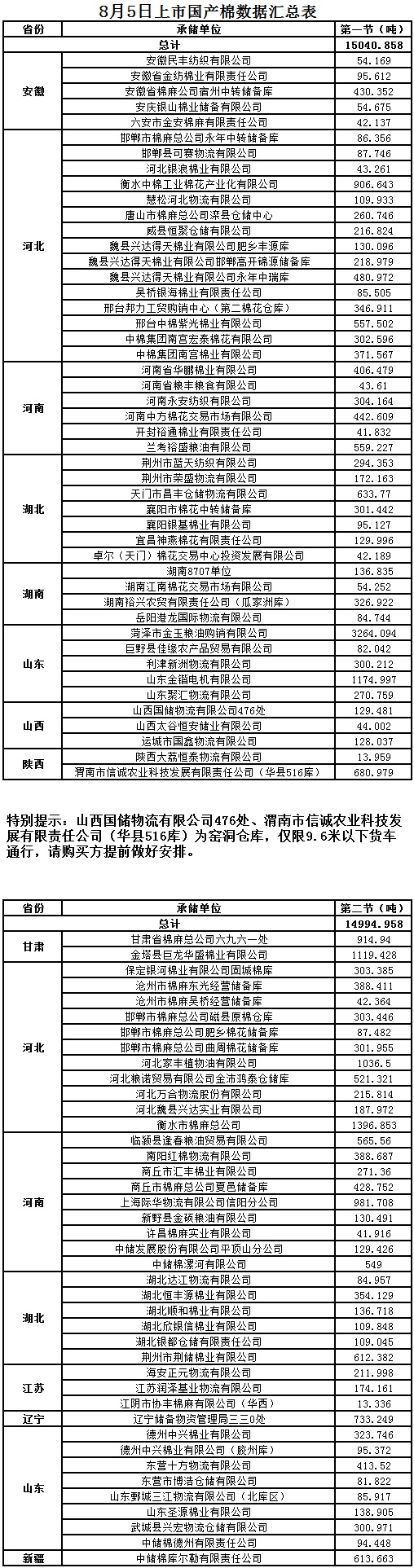8月5日兩節(jié)共計輪出儲備棉30035.816噸。第一節(jié)銷售儲備棉15040.8580噸,其中國產(chǎn)棉15040.8580噸、進(jìn)口棉0噸。第二節(jié)銷售儲備棉14994.9580噸,其中國產(chǎn)棉14994.9580噸、進(jìn)口棉0噸。