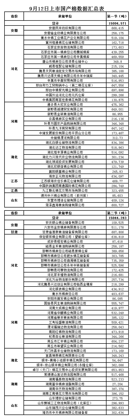 9月12日兩節(jié)共計輪出儲備棉30048.854噸。第一節(jié)銷售儲備棉15004.5710噸,其中國產棉15004.5710噸、進口棉0噸。第二節(jié)銷售儲備棉15044.2830噸,其中國產棉15044.2830噸、進口棉0噸。