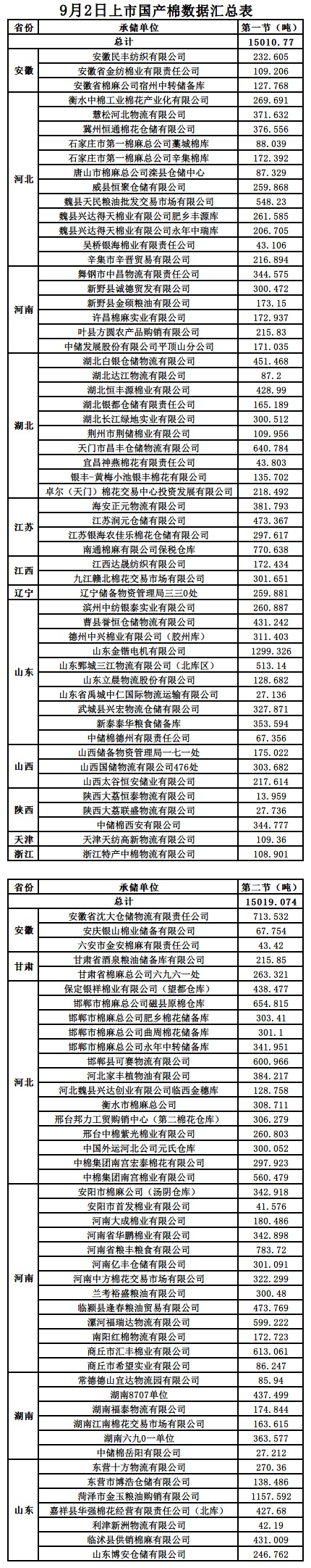 9月2日兩節(jié)共計(jì)輪出儲(chǔ)備棉30029.8440噸。9月2日第一節(jié)計(jì)劃輪出儲(chǔ)備棉15010.7700噸,其中國產(chǎn)棉15010.7700噸、進(jìn)口棉0噸。9月2日第二節(jié)計(jì)劃輪出儲(chǔ)備棉15019.0740噸,其中國產(chǎn)棉15019.0740噸、進(jìn)口棉0噸。