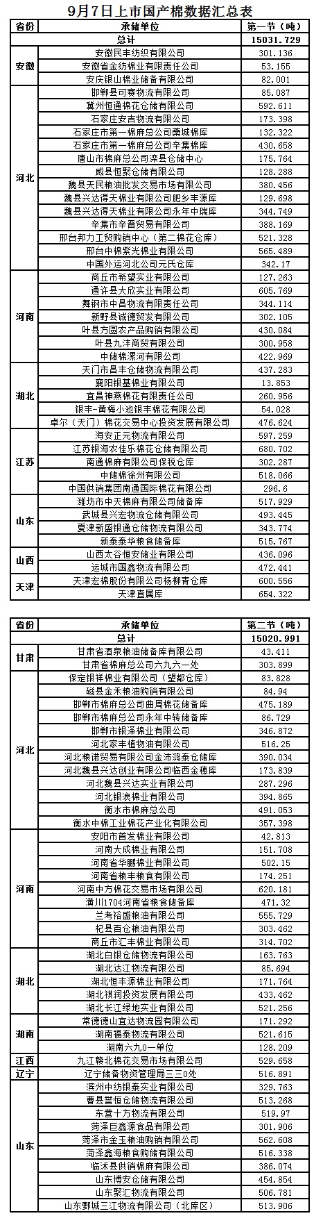 9月7日兩節(jié)共計輪出儲備棉30052.720噸。第一節(jié)銷售儲備棉15031.7290噸,其中國產棉15031.7290噸、進口棉0噸。第二節(jié)銷售儲備棉15020.9910噸,其中國產棉15020.9910噸、進口棉0噸。