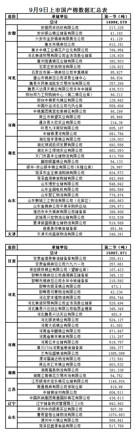 9月9日兩節(jié)共計輪出儲備棉30001.6500噸。第一節(jié)銷售儲備棉14994.5790噸,其中國產(chǎn)棉14994.5790噸、進口棉0噸。第二節(jié)銷售儲備棉15007.0710噸,其中國產(chǎn)棉15007.0710噸、進口棉0噸。