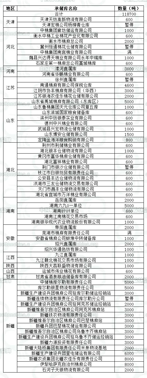 錦橋紡織網(wǎng)—資訊頻道> 棉花信息> 收儲>正文 10月16日收儲預(yù)告:計劃收儲118700噸
