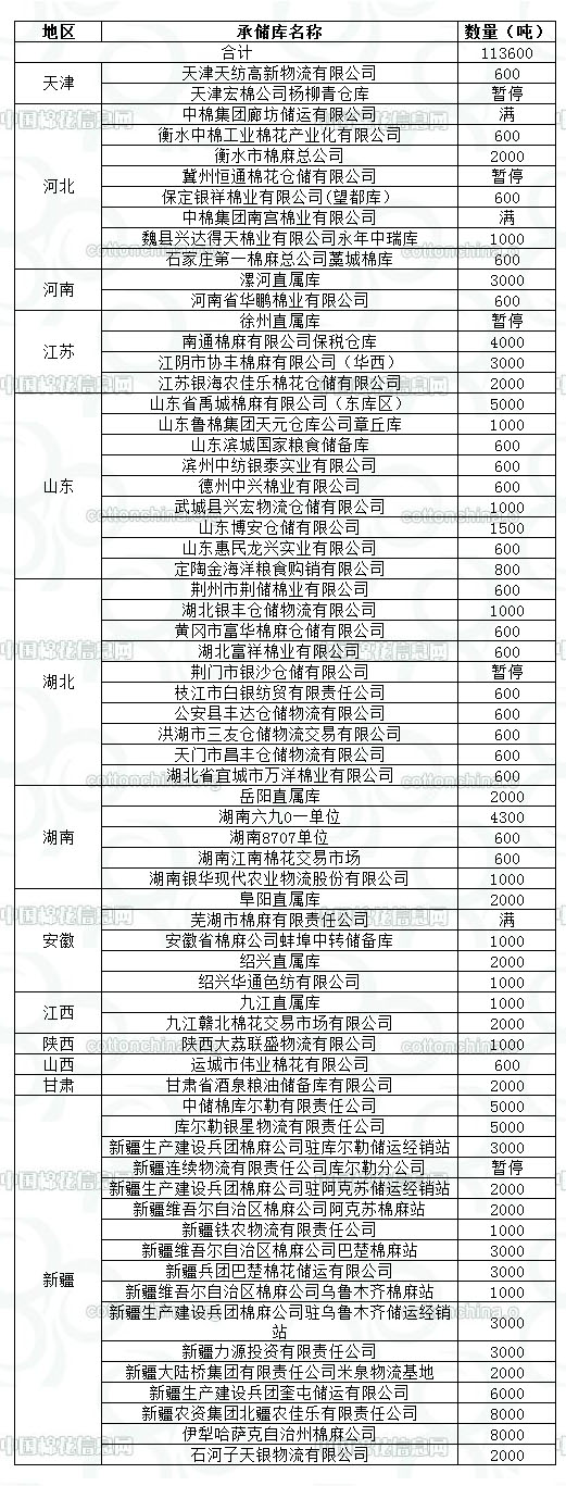 錦橋紡織網(wǎng)—資訊頻道> 棉花信息> 收儲>正文 10月18日收儲預(yù)告:計劃收儲113600噸