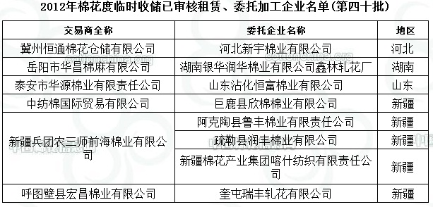 2012年度棉花臨時(shí)收儲(chǔ)已審核租賃、委托加工企業(yè)名單(第四十批)