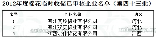 2012年度棉花臨時(shí)收儲(chǔ)已審核企業(yè)名單(第四十三批)