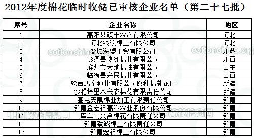 2012年度棉花臨時(shí)收儲(chǔ)已審核企業(yè)名單(第二十七批)