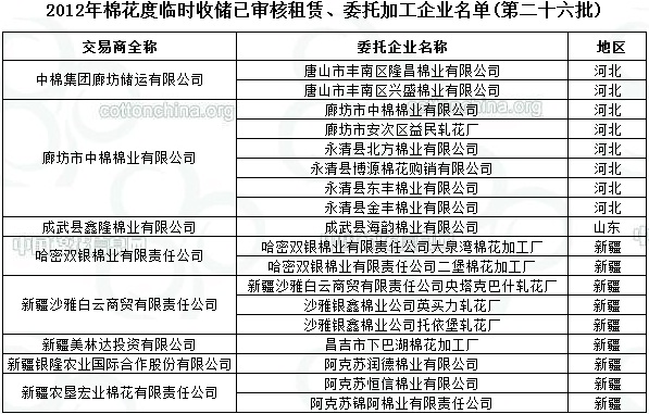 2012年棉花度臨時收儲已審核租賃、委托加工企業(yè)名單(第二十六批)