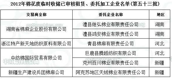 錦橋紡織網—資訊頻道> 棉花信息> 收儲>正文 2012年度棉花臨時收儲已審核租賃、委托加工企業(yè)名單(第五十三批)