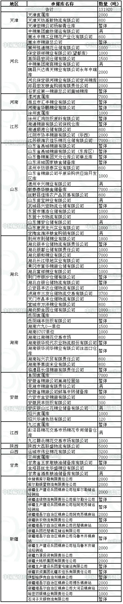 錦橋紡織網(wǎng)—資訊頻道> 棉花信息> 收儲>正文 11月14日收儲預(yù)告:計(jì)劃收儲131920噸