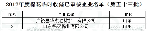 2012年度棉花臨時收儲已審核企業(yè)名單(第五十三批)