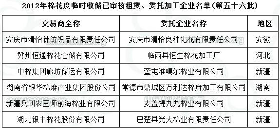2012年度棉花臨時(shí)收儲(chǔ)已審核租賃、委托加工企業(yè)名單(第五十六批)
