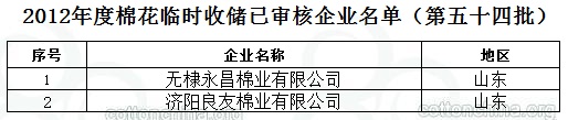 2012年度棉花臨時(shí)收儲(chǔ)已審核企業(yè)名單(第五十四批)