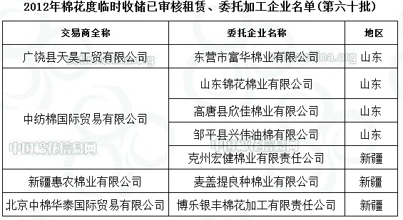 2012年度棉花臨時(shí)收儲(chǔ)已審核租賃、委托加工企業(yè)名單(第六十批)
