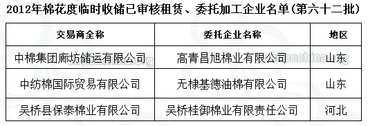 2012年度棉花臨時(shí)收儲(chǔ)已審核租賃、委托加工企業(yè)名單(第六十二批)