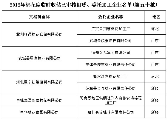 2012年度棉花臨時收儲已審核租賃、委托加工企業(yè)名單(第五十批)