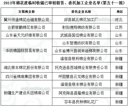 2012年度棉花臨時(shí)收儲(chǔ)已審核租賃、委托加工企業(yè)名單(第五十一批)