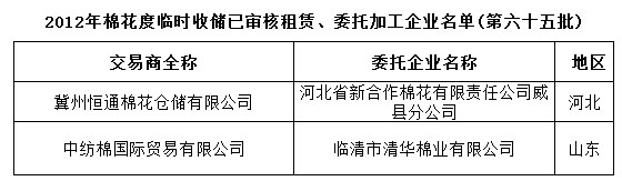 2012年度棉花臨時收儲已審核租賃、委托加工企業(yè)名單(第六十五批)