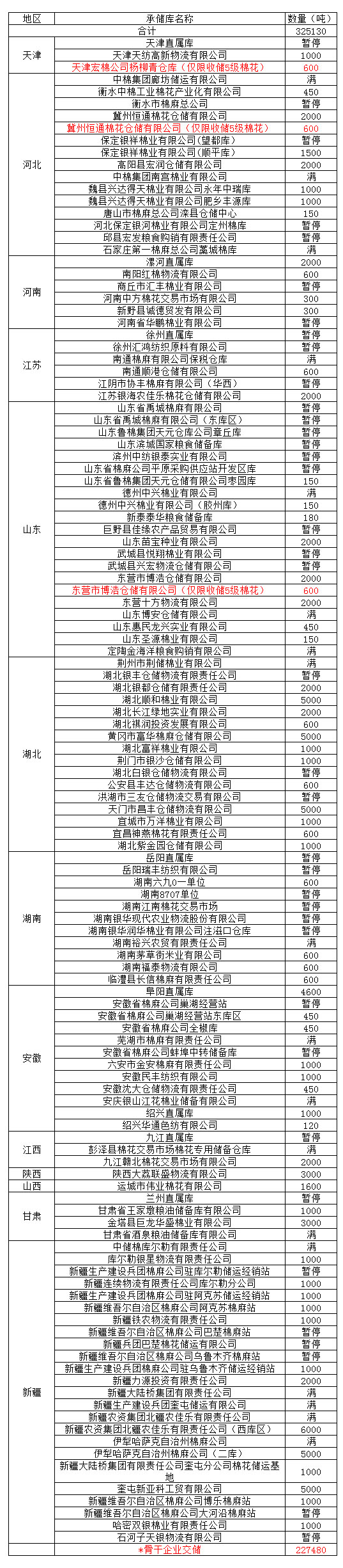 定于12月14日在以下指定倉庫收儲2012年度棉花325130噸(含骨干企業(yè)交儲棉花227480噸)。哈密雙銀棉業(yè)有限責任公司僅限東疆棉花企業(yè)競拍,新疆維吾爾自治區(qū)棉麻公司博樂棉麻站僅限于博樂地區(qū)棉花企業(yè)競拍,以上庫點其他地區(qū)企業(yè)競拍將按違約處理。